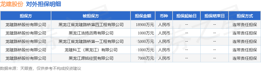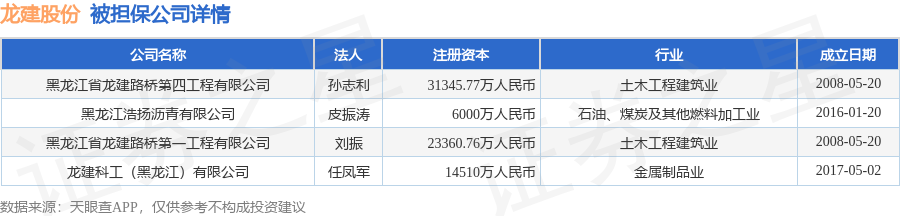 龙建股份10月27日披露5笔对外担保,被担保公司5家。对外担保明细如下表: