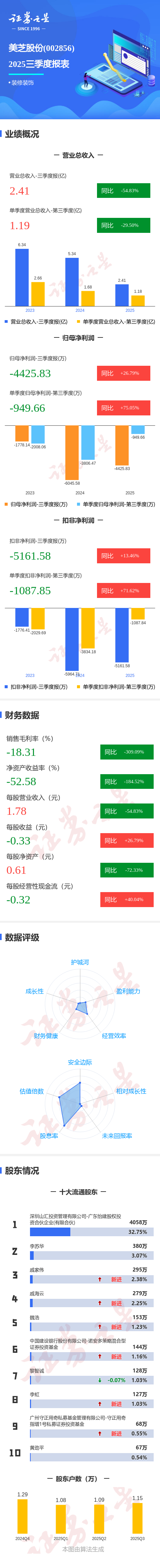 证券之星消息,美芝股份2025年三季报显示,前三季度公司主营收入2.41亿元,同比下降54.84%;归母净利润-4425.83万元,同比上升26.79%;扣非净利润-5161.58万元,同比上升13.46%;其中2025年第三季度,公司单季度主营收入1.19亿元,同比下降29.5%;单季度归母净利润-949.66万元,同比上升75.05%;单季度扣非净利润-1087.85万元,同比上升71.63%;负债率95.41%,投资收益-77.23万元,财务费用599.53万元,毛利率-18.31%。