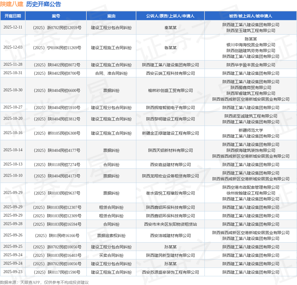 案号:(2025)陕0402民初8700号根据统计,近一年内以陕西建工第八建设集团有限公司为当事人的历史开庭公告有156则,其中案由为“建设工程施工合同纠纷”的公告以26则居首,其次为“票据追索权纠纷”有25则,“建设工程分包合同纠纷”有24则。历史开庭公告(前20条)如下: