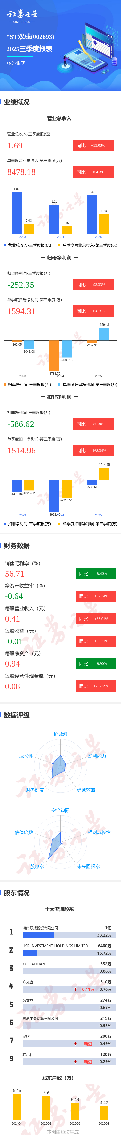 证券之星消息,*ST双成2025年三季报显示,前三季度公司主营收入1.69亿元,同比上升33.04%;归母净利润-252.35万元,同比上升93.33%;扣非净利润-586.62万元,同比上升85.31%;其中2025年第三季度,公司单季度主营收入8478.18万元,同比上升164.39%;单季度归母净利润1594.31万元,同比上升176.31%;单季度扣非净利润1514.96万元,同比上升168.35%;负债率49.32%,投资收益7.06万元,财务费用716.6万元,毛利率56.71%。