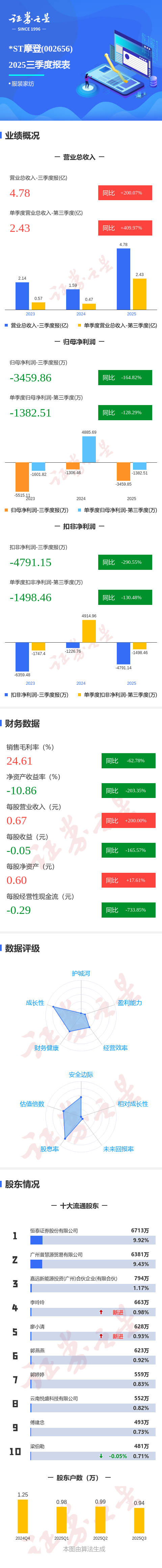 证券之星消息,*ST摩登2025年三季报显示,前三季度公司主营收入4.78亿元,同比上升200.07%;归母净利润-3459.86万元,同比下降164.83%;扣非净利润-4791.15万元,同比下降290.55%;其中2025年第三季度,公司单季度主营收入2.43亿元,同比上升409.97%;单季度归母净利润-1382.51万元,同比下降128.3%;单季度扣非净利润-1498.46万元,同比下降130.49%;负债率42.89%,投资收益631.41万元,财务费用-138.77万元,毛利率24.61%。