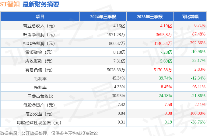 据证券之星公开数据整理,近期ST智知(603869)发布2025年三季报。截至本报告期末,公司营业总收入4.19亿元,同比上升0.71%,归母净利润3695.8万元,同比上升87.48%。按单季度数据看,第三季度营业总收入1.42亿元,同比上升24.6%,第三季度归母净利润2004.54万元,同比上升1115.37%。本报告期ST智知公司应收账款体量较大,当期应收账款占最新年报归母净利润比达2742.1%。
