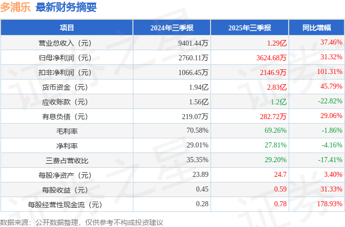 据证券之星公开数据整理,近期多浦乐(301528)发布2025年三季报。截至本报告期末,公司营业总收入1.29亿元,同比上升37.46%,归母净利润3624.68万元,同比上升31.32%。按单季度数据看,第三季度营业总收入4924.63万元,同比上升15.05%,第三季度归母净利润1720.91万元,同比上升61.96%。本报告期多浦乐公司应收账款体量较大,当期应收账款占最新年报归母净利润比达232.82%。
