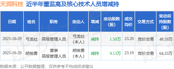天润科技近半年内的董监高及核心技术人员增减持详情如下: