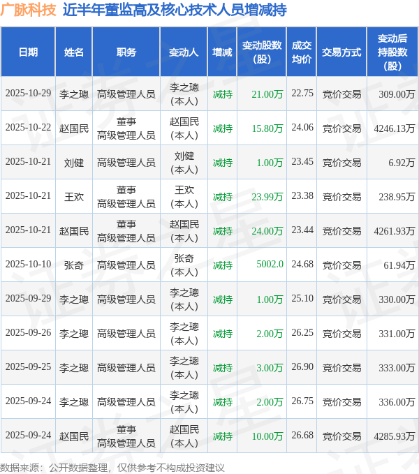 广脉科技近半年内的董监高及核心技术人员增减持详情如下: