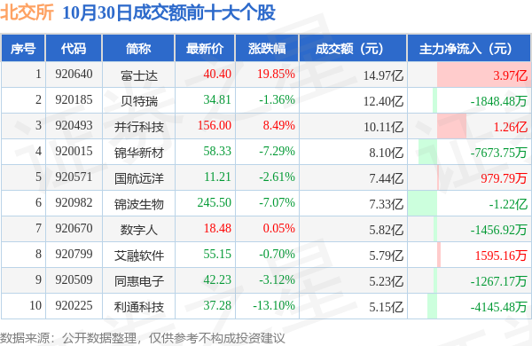 当日北交所成交额前10大个股中3只个股收涨,平均涨幅9.46%,其中富士达(920640)以成交额14.97亿元排第一。从主力资金流入看,成交额前10大个股中有4只个股呈现主力资金净流入。