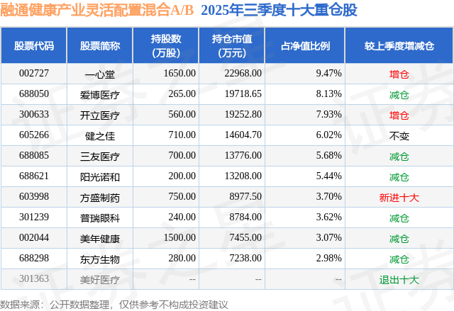 根据2025基金Q3季报公募基金重仓股数据,重仓该股的公募基金共21家,其中持有数量最多的公募基金为融通基金的融通健康产业灵活配置混合A/B。融通健康产业灵活配置混合A/B目前规模为18.16亿元,最新净值2.782(10月29日),较上一交易日下跌1.31%,近一年上涨9.23%。该公募基金现任基金经理为万民远。万民远在任的基金产品包括:融通鑫新成长混合A,管理时间为2021年10月8日至今,期间收益率为34.61%;融通价值成长混合A,管理时间为2022年7月18日至今,期间收益率为28.13%;融通医疗保健行业混合A/B,管理时间为2023年3月15日至今,期间收益率为-18.88%。