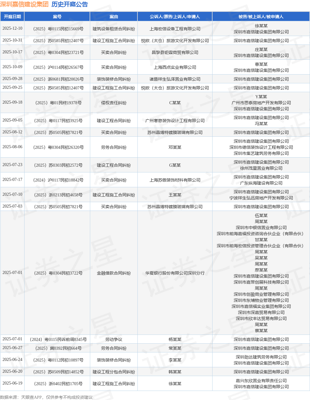 案号:(2025)苏0585民初12407号根据统计,近一年内以深圳市嘉信建设集团有限公司为当事人的历史开庭公告有92则,其中案由为“买卖合同纠纷”的公告以27则居首,其次为“建设工程施工合同纠纷”有15则,“装饰装修合同纠纷”有11则。历史开庭公告(前20条)如下: