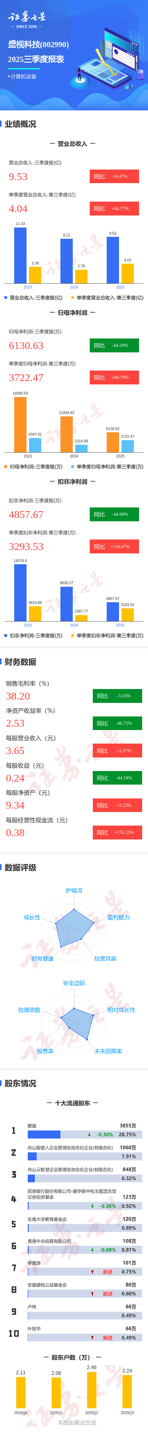 证券之星消息,盛视科技2025年三季报显示,前三季度公司主营收入9.53亿元,同比上升4.47%;归母净利润6130.63万元,同比下降44.29%;扣非净利润4857.67万元,同比下降44.99%;其中2025年第三季度,公司单季度主营收入4.04亿元,同比上升44.77%;单季度归母净利润3722.47万元,同比上升60.8%;单季度扣非净利润3293.53万元,同比上升110.08%;负债率34.69%,投资收益1221.17万元,财务费用43.96万元,毛利率38.2%。