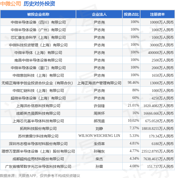 通过天眼查大数据分析,中微半导体设备(上海)股份有限公司共对外投资了29家企业,参与招投标项目67次;财产线索方面有商标信息99条,专利信息1593条,著作权信息13条;此外企业还拥有行政许可76个。据2024年报数据,中微公司长期股权投资8.7亿元,同比减14.71%。