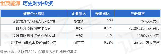 证券之星消息,根据天眼查APP显示,世茂能源(605028.SH)新增一起对外投资事件,被投资公司为旺能环境股份有限公司,法定代表人单超,投资占比为0.88%。该公司从事生态保护和环境治理业,注册资本为42620.6214万人民币。目前,世茂能源共存在对外投资4项,详见下表: