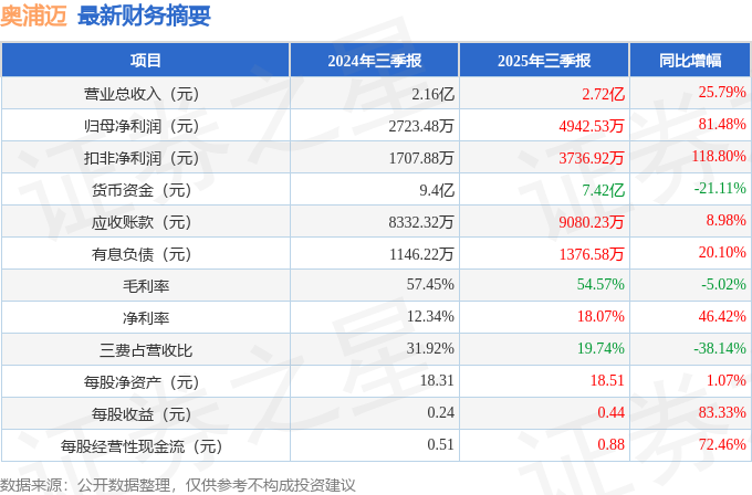 据证券之星公开数据整理,近期奥浦迈(688293)发布2025年三季报。根据财报显示,奥浦迈营收净利润同比双双增长。截至本报告期末,公司营业总收入2.72亿元,同比上升25.79%,归母净利润4942.53万元,同比上升81.48%。按单季度数据看,第三季度营业总收入9377.91万元,同比上升29.8%,第三季度归母净利润1187.84万元,同比上升283.59%。
