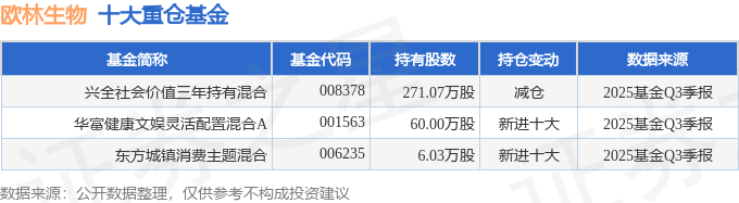 持有欧林生物最多的基金为兴全社会价值三年持有混合,目前规模为16.97亿元,最新净值2.1755(10月29日),较上一交易日上涨1.31%,近一年上涨59.44%。该基金现任基金经理为谢治宇。