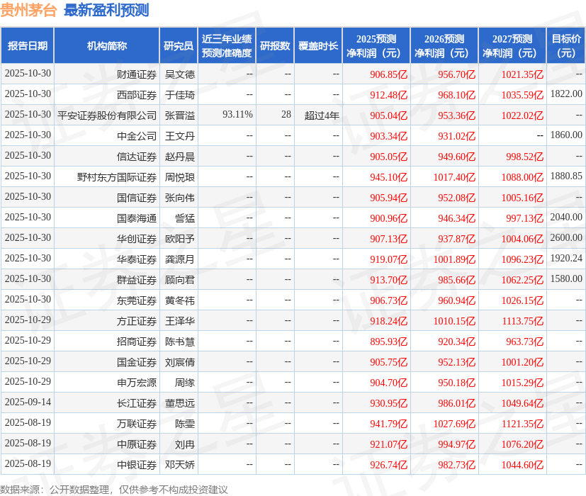 证券之星数据中心根据近三年发布的研报数据计算,平安证券股份有限公司张晋溢研究员团队对该股研究较为深入,近三年预测准确度均值高达93.11%,其预测2025年度归属净利润为盈利905.04亿,根据现价换算的预测PE为19.74。