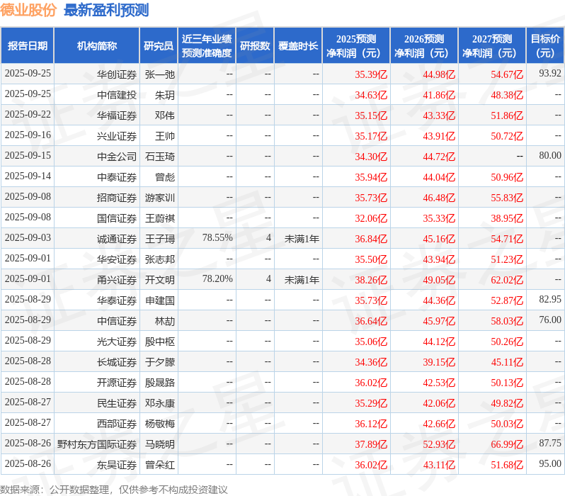 最新盈利预测明细如下: