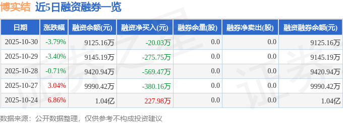 博实结融资融券信息显示,融资方面,当日融资买入892.48万元,融资偿还912.52万元,融资净偿还20.03万元。融券方面,融券卖出0.0股,融券偿还0.0股,融券余量0.0股,融券余额0.0万元。融资融券余额9125.16万元。