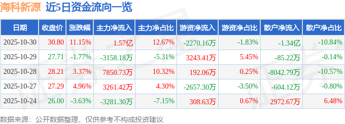 10月30日的资金流向数据方面,主力资金净流入1.57亿元,占总成交额12.67%,游资资金净流出2270.16万元,占总成交额1.83%,散户资金净流出1.34亿元,占总成交额10.84%。