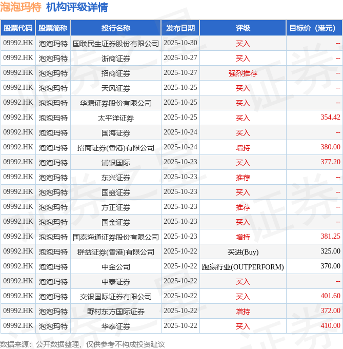 投行对该股的评级以买入为主,近90天内共有39家投行给出买入评级,近90天的目标均价为374.28港元。国联民生证券股份有限公司最新一份研报给予泡泡玛特买入评级。