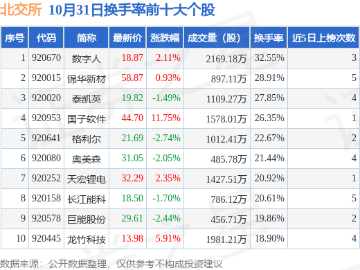 当日北交所换手率前10大个股中5只个股收涨,平均涨幅4.61%,其中数字人(920670)以换手率32.55%排第一,8只个股近5个交易日中多次上榜。