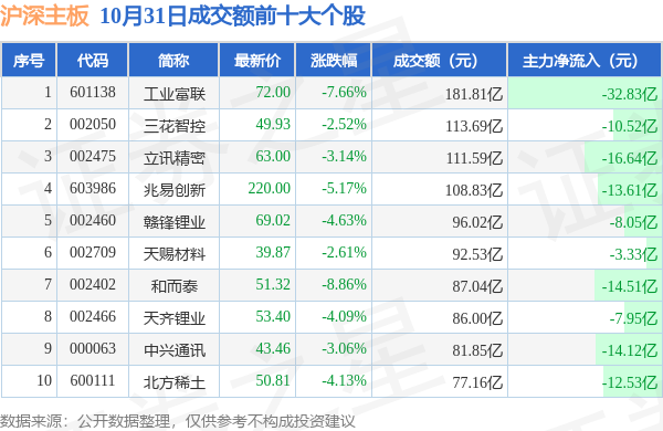 当日成交额前10大个股全线下跌,其中工业富联(601138)以成交额181.81亿元排第一。