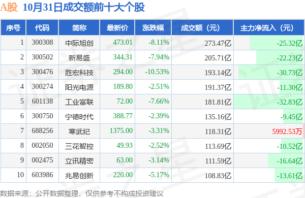当日成交额前10大个股全线下跌,其中中际旭创(300308)以成交额273.47亿元排第一。从主力资金流入看,成交额前10大个股中有1只个股呈现主力资金净流入。