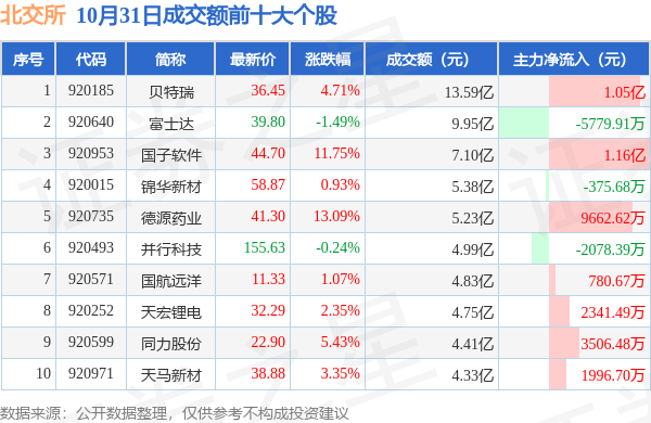 当日北交所成交额前10大个股中8只个股收涨,平均涨幅5.33%,其中贝特瑞(920185)以成交额13.59亿元排第一。从主力资金流入看,成交额前10大个股中有7只个股呈现主力资金净流入。