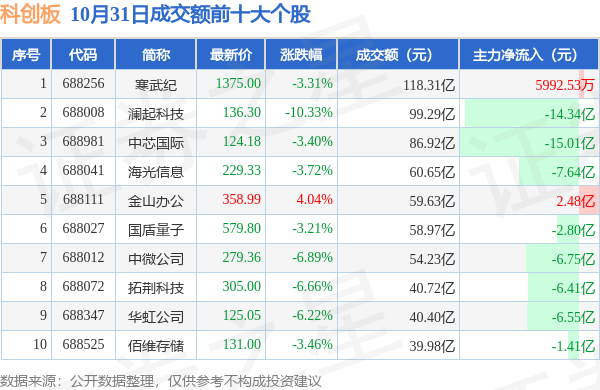 当日科创板成交额前10大个股中1只个股收涨,平均涨幅4.04%,其中寒武纪(688256)以成交额118.31亿元排第一。从主力资金流入看,成交额前10大个股中有2只个股呈现主力资金净流入。