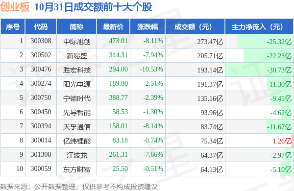 当日成交额前10大个股全线下跌,其中中际旭创(300308)以成交额273.47亿元排第一。从主力资金流入看,成交额前10大个股中有1只个股呈现主力资金净流入。