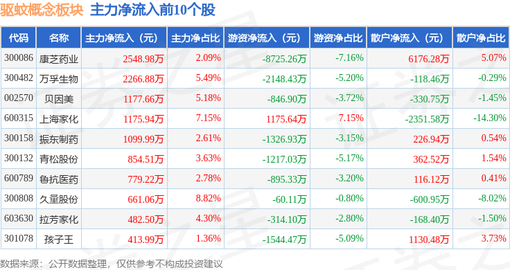 从资金流向上来看,当日驱蚊概念板块主力资金净流入4946.73万元,游资资金净流出1.8亿元,散户资金净流入1.31亿元。驱蚊概念板块个股资金流向见下表:
