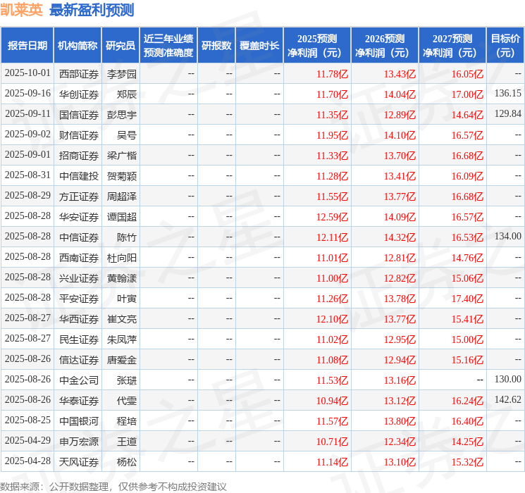 最新盈利预测明细如下: