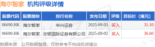 投行对该股的评级以买入为主,近90天内共有2家投行给出买入评级,近90天的目标均价为33.85港元。华兴证券最新一份研报给予海尔智家买入评级,目标价31.1港元。