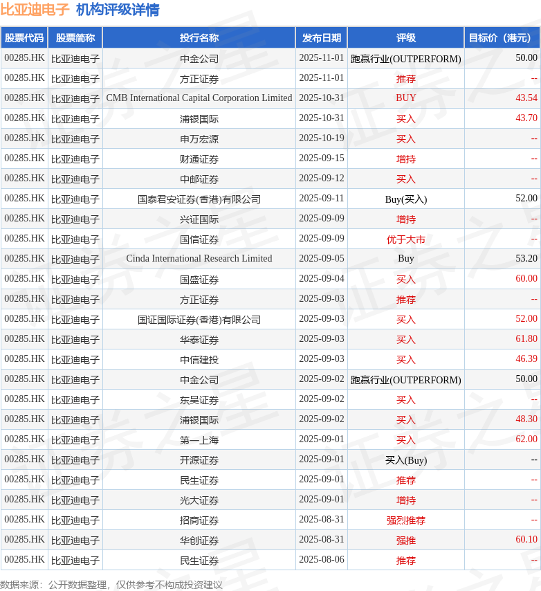 投行对该股的评级以买入为主,近90天内共有10家投行给出买入评级,近90天的目标均价为52.54港元。中金公司最新一份研报给予比亚迪电子跑赢行业(OUTPERFORM)评级,目标价50港元。