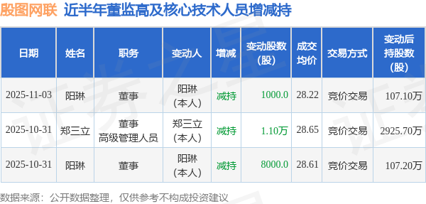 证券之星消息,根据11月4日市场公开信息、上市公司公告及交易所披露数据整理,殷图网联(920508)最新董监高及相关人员股份变动情况:2025年11月3日公司董事阳琳共减持公司股份1000.0股,占公司总股本为0.0017%。变动期间公司股价下跌1.71%,11月3日当日收盘报27.55元。