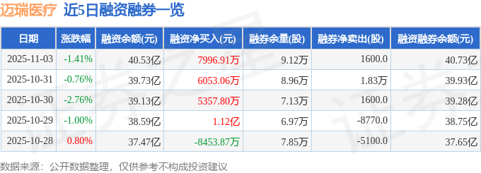 迈瑞医疗融资融券信息显示,融资方面,当日融资买入2.71亿元,融资偿还1.91亿元,融资净买入7996.91万元,连续3日净买入累计1.94亿元。融券方面,融券卖出3100.0股,融券偿还1500.0股,融券余量9.12万股,融券余额1933.53万元。融资融券余额40.73亿元。
