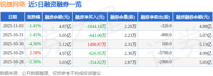 锐捷网络融资融券信息显示,融资方面,当日融资买入3189.76万元,融资偿还5033.9万元,融资净偿还1844.14万元。融券方面,融券卖出1100.0股,融券偿还1420.0股,融券余量2.2万股,融券余额161.17万元。融资融券余额4.88亿元。