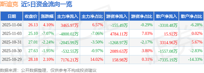 证券之星消息,截至2025年11月4日收盘,斯迪克(300806)报收于26.13元,上涨4.1%,换手率6.43%,成交量20.34万手,成交额5.27亿元。