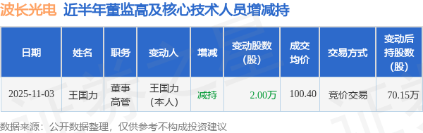 证券之星消息,根据11月4日市场公开信息、上市公司公告及交易所披露数据整理,波长光电(301421)最新董监高及相关人员股份变动情况:2025年11月3日公司董事,高管王国力共减持公司股份2.0万股,占公司总股本为0.0173%。变动期间公司股价上涨3.21%,11月3日当日收盘报103.96元。