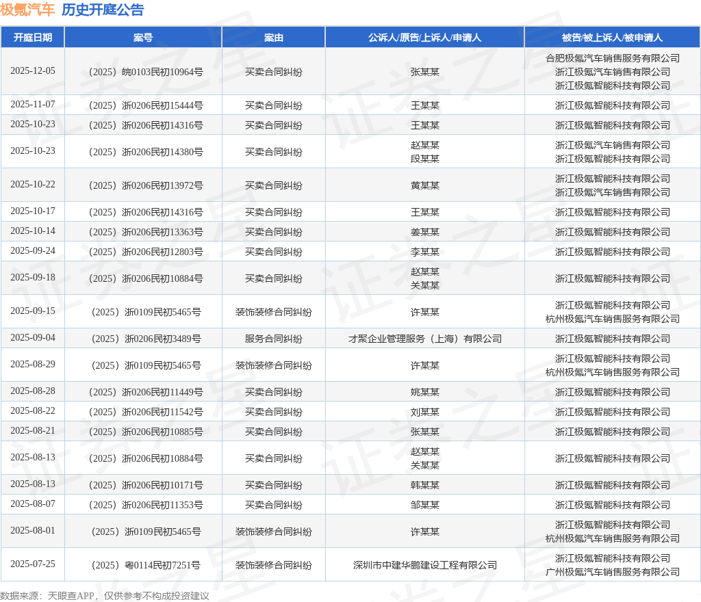案号:(2025)浙0206民初15444号根据统计,近一年内以浙江极氪智能科技有限公司为当事人的历史开庭公告有56则,其中案由为“买卖合同纠纷”的公告以30则居首,其次为“装饰装修合同纠纷”有11则,“产品责任纠纷”有3则。历史开庭公告(前20条)如下: