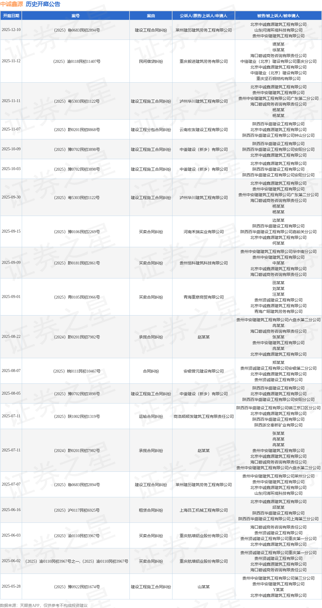 案号:(2025)黔0201民初8868号根据统计,近一年内以北京中诚鑫源建筑工程有限公司为当事人的历史开庭公告有29则,其中案由为“买卖合同纠纷”的公告以8则居首,其次为“建设工程施工合同纠纷”有6则,“建设工程合同纠纷”有4则。历史开庭公告(前20条)如下: