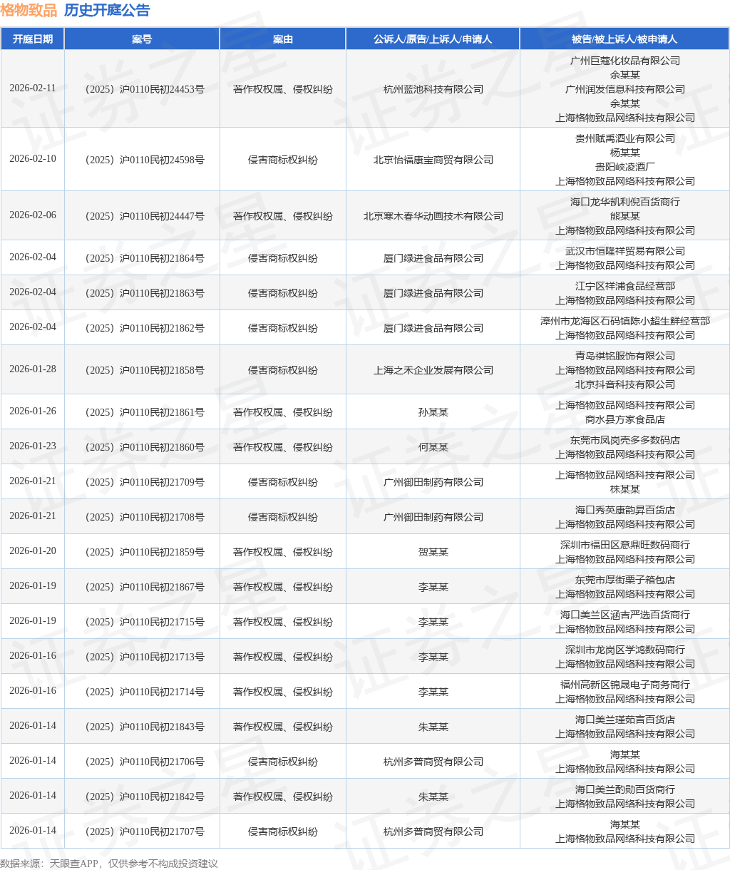 案号:(2025)粤0192民初23677号根据统计,近一年内以上海格物致品网络科技有限公司为当事人的历史开庭公告有3281则,其中案由为“侵害外观设计专利权纠纷”的公告以769则居首,其次为“侵害商标权纠纷”有666则,“著作权权属、侵权纠纷”有508则。历史开庭公告(前20条)如下: