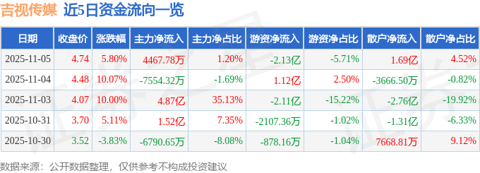 11月5日的资金流向数据方面,主力资金净流入4467.78万元,占总成交额1.2%,游资资金净流出2.13亿元,占总成交额5.71%,散户资金净流入1.69亿元,占总成交额4.52%。