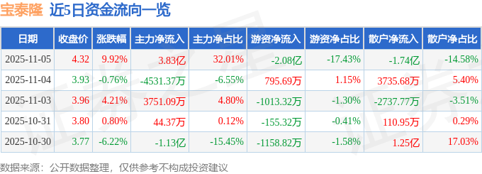 11月5日的资金流向数据方面,主力资金净流入3.83亿元,占总成交额32.01%,游资资金净流出2.08亿元,占总成交额17.43%,散户资金净流出1.74亿元,占总成交额14.58%。
