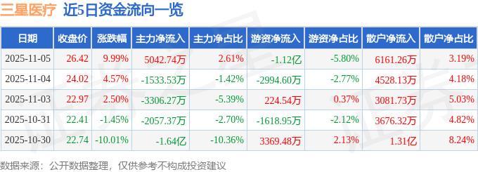 证券之星消息,三星医疗11月5日涨停收盘,收盘价26.42元。该股于13点27分涨停,3次打开涨停,截止收盘封单资金为708.85万元,占其流通市值0.02%。