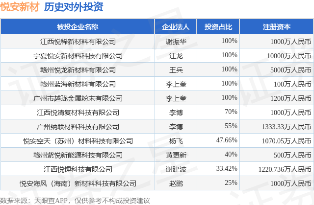 证券之星消息,根据天眼查APP显示,悦安新材(688786.SH)新增一起对外投资事件,被投资公司为江西悦稀新材料有限公司,法定代表人谢振华,投资占比为100%。该公司从事有色金属冶炼和压延加工业,注册资本为1000万人民币。目前,悦安新材共存在对外投资11项,详见下表: