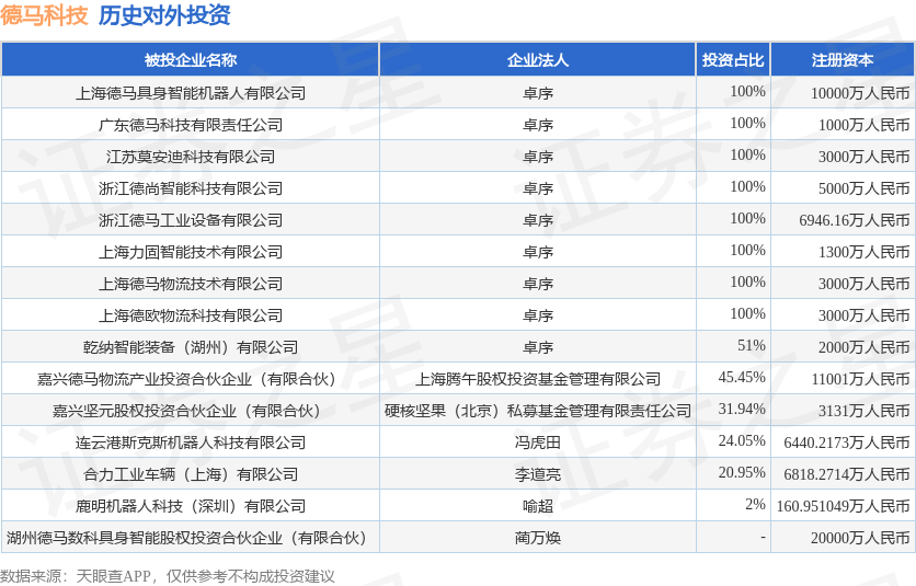 证券之星消息,根据天眼查APP显示,德马科技(688360.SH)新增一起对外投资事件,被投资公司为上海德马具身智能机器人有限公司,法定代表人卓序,投资占比为100%。该公司从事计算机、通信和其他电子设备制造业,注册资本为10000万人民币。目前,德马科技共存在对外投资15项,详见下表: