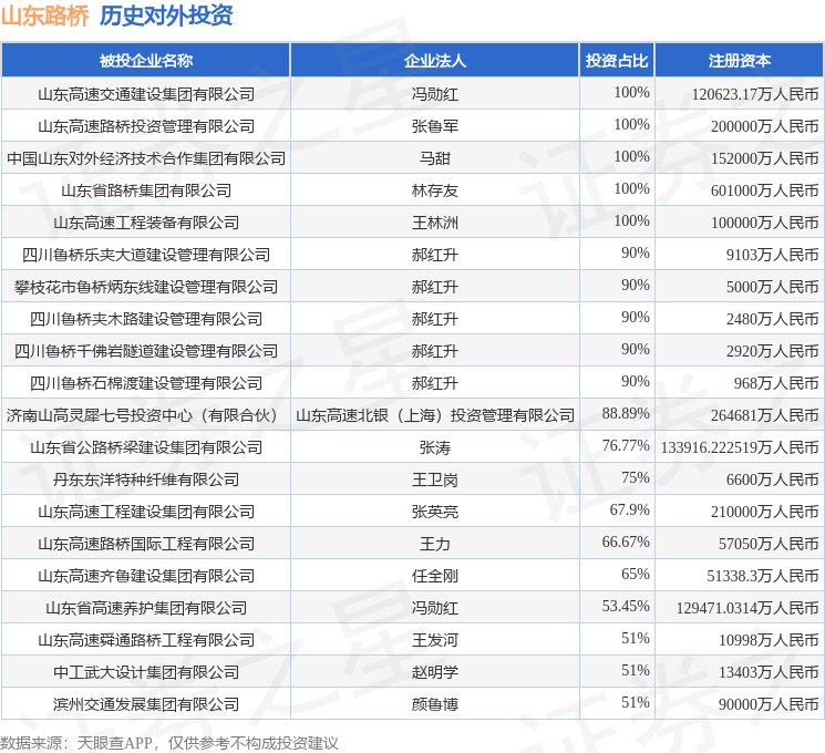 证券之星消息,根据天眼查APP显示,山东路桥(000498.SZ)新增一起对外投资事件,被投资公司为山东高速畅通路桥工程有限公司,法定代表人刘性锋,投资占比为51%。该公司从事土木工程建筑业,注册资本为50000万人民币。目前,山东路桥共存在对外投资35项,投资占比前20的项目见下表: