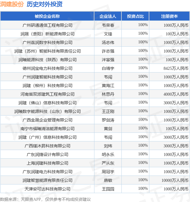 证券之星消息,根据天眼查APP显示,润建股份(002929.SZ)新增一起对外投资事件,被投资公司为南宁润道智算科技有限公司,法定代表人赖凯,投资占比为45%。该公司从事软件和信息技术服务业,注册资本为1000万人民币。目前,润建股份共存在对外投资102项,投资占比前20的项目见下表: