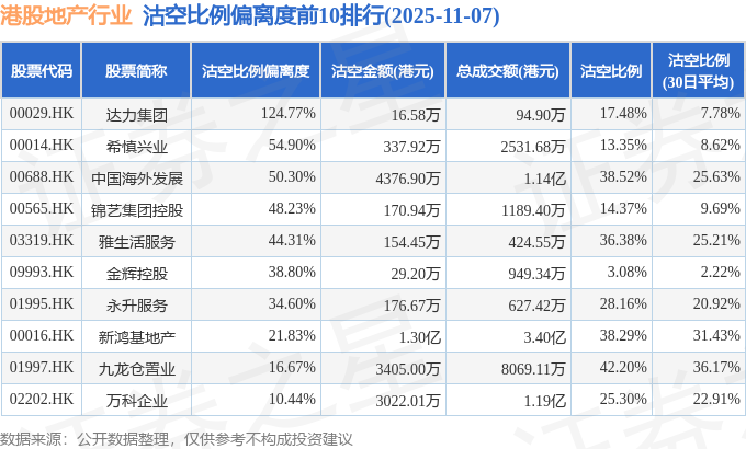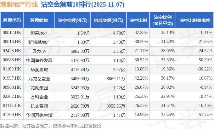 11月7日港股地产行业沽空数据盘点,恒基地产、新鸿基地产、贝壳-W沽空金额位居行业前三