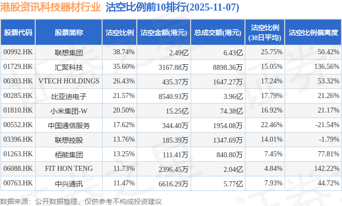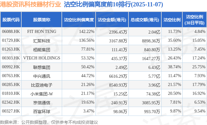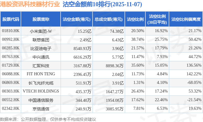 11月7日港股资讯科技器材行业沽空数据盘点,小米集团-W、联想集团、比亚迪电子沽空金额位居行业前三