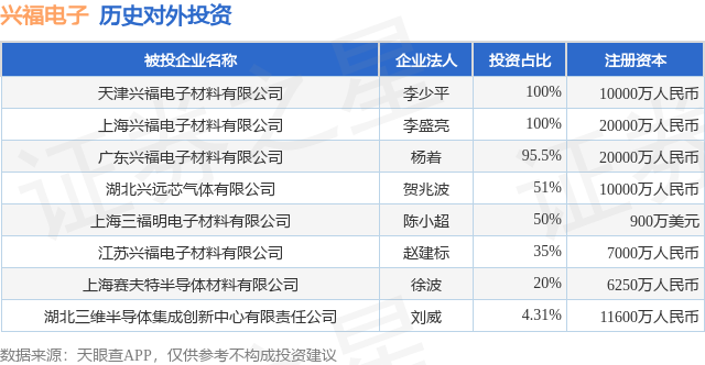 证券之星消息,根据天眼查APP显示,兴福电子(688545.SH)新增一起对外投资事件,被投资公司为广东兴福电子材料有限公司,法定代表人杨着,投资占比为95.5%。该公司从事计算机、通信和其他电子设备制造业,注册资本为20000万人民币。目前,兴福电子共存在对外投资8项,详见下表: